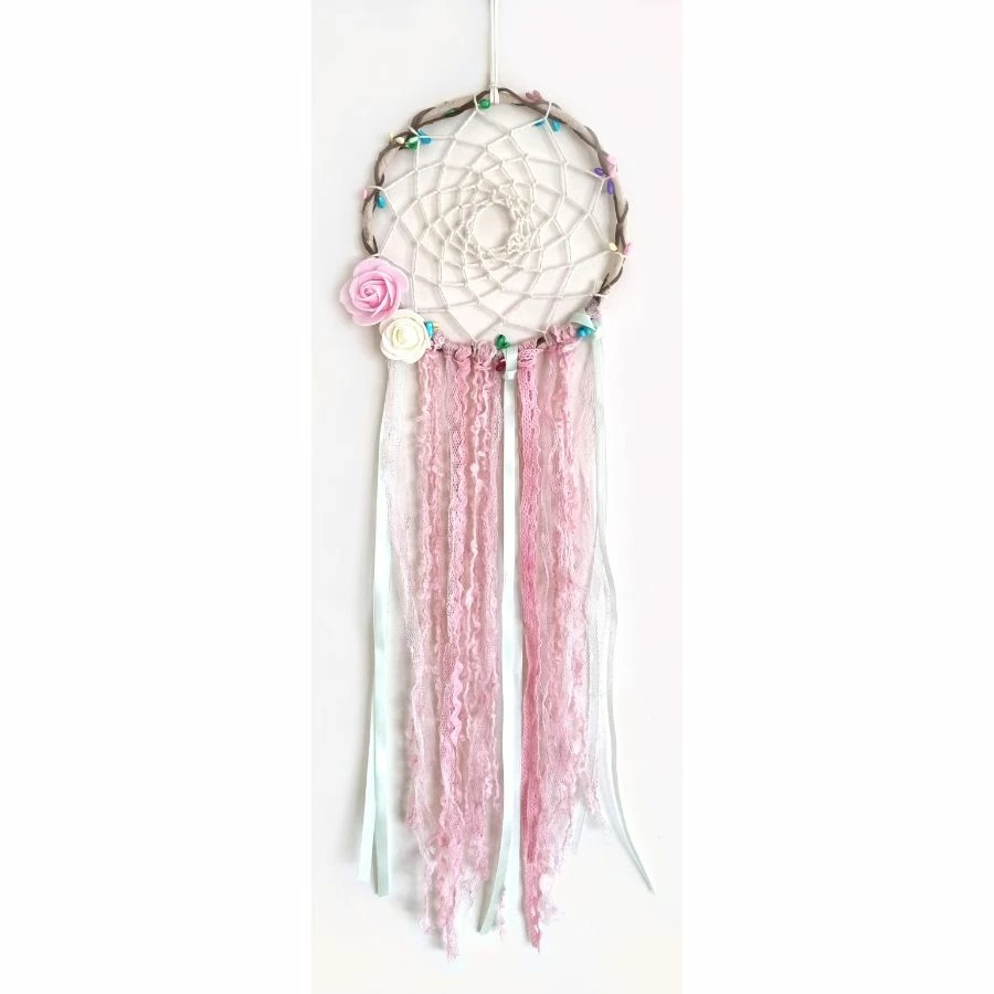 Dream catchers are made with a purpose – to bring positivity and attract good vibes. They are symbolic and are known to keep nightmares away and promote peaceful sleep. This pretty dream catcher is made with a wooden hoop that has been woven with a pretty design with crochet thread and some beads. Several pieces of lace in colours of white and pink have been used as long hangings for this dream catcher. Two roses in pink and white have been added in the corner of the hoop – making it look even prettier. They look lovely, and a random design and colour dream catcher will be sent on purchase. The dream catcher looks lovely and can be placed anywhere in the bedroom of adults or kids. It looks attractive and is also meaningful. It can be presented to someone on various occasions, including their Birthday, Christmas, Easter or others. Dream Catcher with Roses can be used by individuals of all ages.