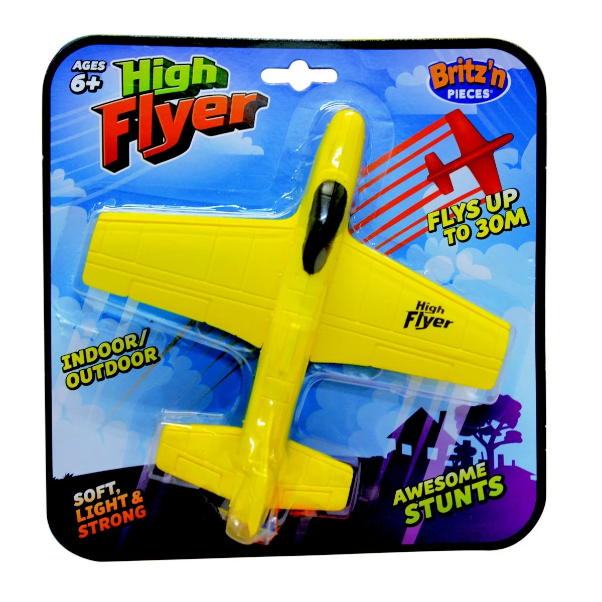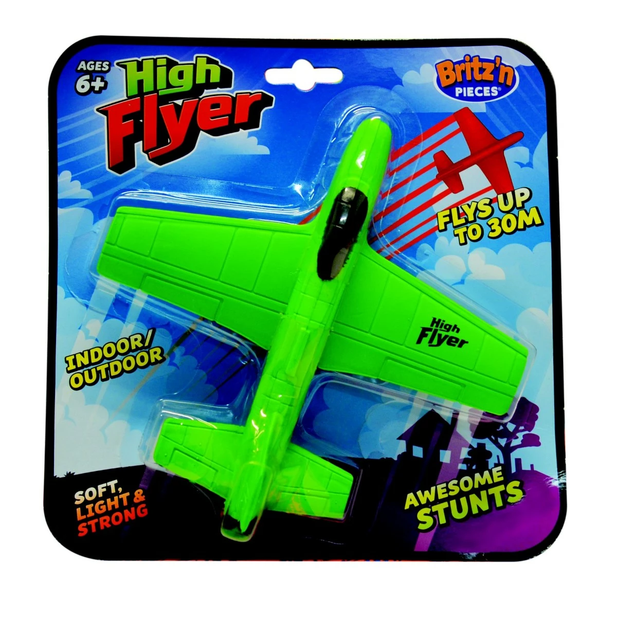 High Flyer is a super fun toy aeroplane by Britz ‘n Pieces. It is built in a model aeroplane structure with two large spread-out wings and an uplifted tail. The limited pilot seating space of this small aircraft is painted black. There is also a printed High Flyer logo on the right-wing. Available in bright red, yellow, and green, this standard design High Flyer comes assorted. Soft, extremely lightweight, but robust, this toy aircraft is made from a unique foam material that allows it to fly real high. It can usually take a flight as high as 30 metres from the ground. Designed in Australia, High Flyer by Britz ‘n Pieces can do many incredible stunts to add more fun to the playtime. High Flyer is equally appropriate for fun-packed indoor or outdoor play. High Flyer by Britz ‘n Pieces is especially recommended for little pilots above six years old.