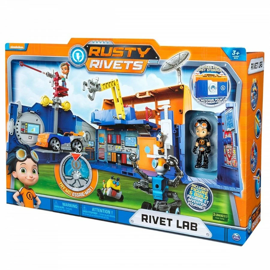 Get busy building with Rusty Rivets from the Rusty Rivets Lab playset. This transforming playset is based on the Nick Jr. tv show named Rusty Rivets. This playset looks like a toolbox; it opens up to reveal Rusty’s lab. A 3.5-inch action figure and a buildable robot with build pieces that snap together can be found inside. The lab has two platforms that can be raised and lowered, attach the projectile launcher to one, giving it a flick with your finger to launch. Press the button on the circular panel for lights, sounds, and music. There are two doors, a swivelling seat for action figures, and a rotating, movable claw arm. You can add other Rusty Rivets toys, (sold separately) for further customization and building play. When playtime is over, close everything back up inside the playset for easy storage. Suitable for ages 3 years and up.